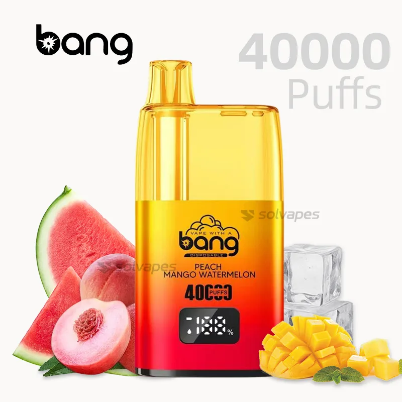 Bang 40000 puff vape with Peach Mango Watermelon flavor and refillable pod.